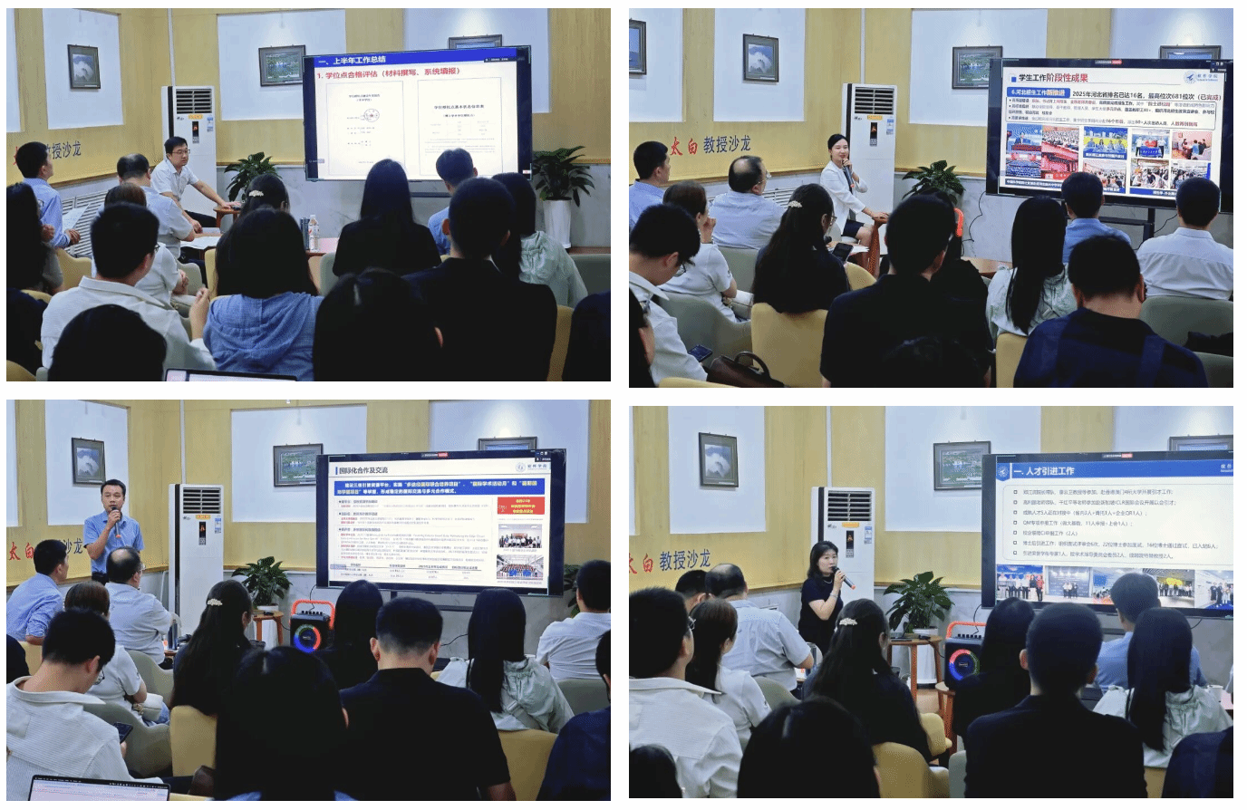 随后,公司各分管领导依次汇报工作。副经理马春燕就教学工作进行了梳理,通报了2025年教材建设、教学成果奖、高水平大赛等“目标责任制”完成情况,从智慧课程建设、教材建设、名师培育、竞赛、思政课程等方面,提出了一系列切实可行的推进计划;副经理郭培荣全面总结了上半年科研工作取得的突破与进展,明确了下半年公司科研攻关“揭榜挂帅”项目推进、科研团队(小组)建设、科研项目申报、保密管理、安全生产工作等重点工作;党委副书记陈博聚焦党建与员工工作,回顾了党建、创新竞赛、共青团工作、员工深造、就业工作、河北招生工作等方面的工作成效,并对新学期重点任务作出了部署;经理助理张凯龙围绕国际化推进工作,总结了引智资源平台建设、优质海外教师引进、国际联合培养、员工出国境交流等方面的成果,并明确了下一步拓展国际合作的目标与路径;办公室主任王宇英就人事与人才工作汇报了人才引进、青年教师培育、人事管理等方面的进展,对下半年人才项目申报、制度与平台建设等重点工作作出了安排。