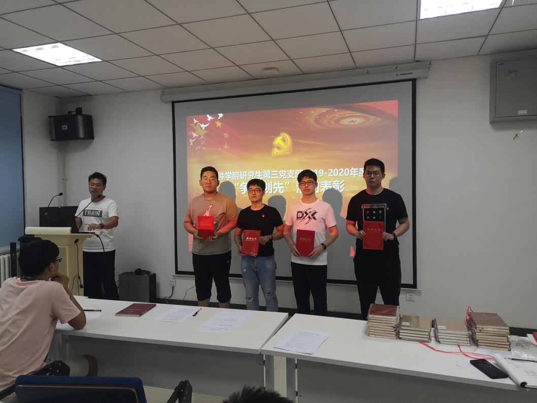 支委工作述职完后,与会党员同志对支部年度整体工作进行民主评议。而后,支部开始进行2019-2020年度“争优创先”评选表彰。“争优创先”活动旨在树立员工党员、党小组模范典型,引导员工党员、党小组更好牢记和践行初心使命。通过前期个人申报、党小组初审推荐、支部审查评选,共评选出14位同志为“优秀员工共产党员”,2个党小组为“先进党小组”。而后,胡轩豪同志、梁奕桢同志代表支委会向获奖的党员同志和党小组进行荣誉证书和奖品的颁发。以上获评党员个人和党小组“始终把人民放在心中最高的位置,始终全心全意为人民服务”,同时立足专业学科,坚持全面发展,给其他同志树立了良好榜样。青年的思想愈被榜样的力量所激励,就愈会发出强烈的光辉,与会的同志们也表示要多向榜样学习,更好提升自己的党性修养和综合素养。