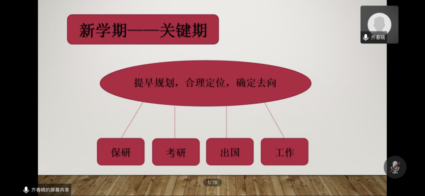 其次,齐春晓老师进行自我介绍,由于工作岗位调整,日后将负责2018级本科生管理工作。齐老师强调,大三是至关重要的一年,是一个重要的分水岭,同学们将面临四种选择:保研、考研、出国和就业。在这个阶段同学们一定要给自己做出规划和清晰的定位,提早进入状态。此外,齐老师也将往届本科和研究生毕业生的就业宝典分享给员工,以供同学们借鉴学习。