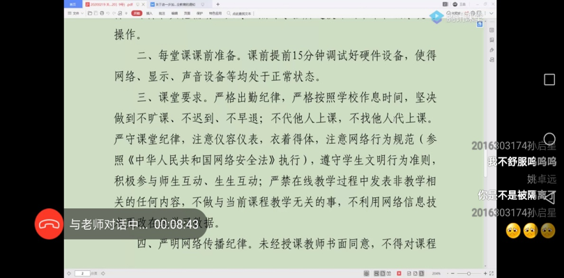 最后,同学们在线提出了一些有关毕业设计工作安排、开学时间、选课等方面的问题,王犇老师对这些问题逐一做了回答。至此,大班会圆满结束。