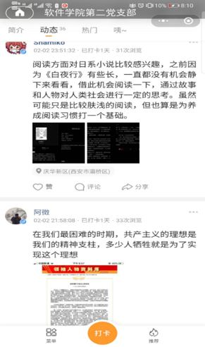 研究生第二党支部组织线上阅读打卡活动,在员工居家防护期间,保持学习,丰富假期生活。本次活动目前共有25名成员参与打卡,打卡次数截止今日累计36次。