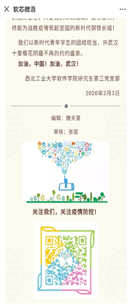 研究生第三党支部通过发起倡议信,号召支部党员,在精神和行动上支持这场疫情战,自发组织捐款献爱心,并将筹款捐献给湖北武汉的同胞们。同时,组织研究生分享考研经验,面向大二、大三、大四年级,开展关于计算机/软件相关专业考研指导义务直播,使员工在居家期间学有所获。