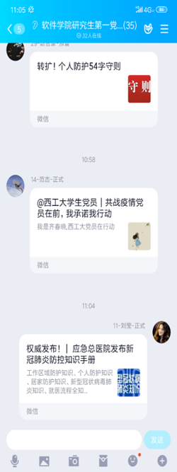 在这场防控疫情的斗争中,员工党支部充分发挥基层党组织战斗堡垒作用和党员先锋模范作用,先后以不同形式开展支部活动,积极宣传防控知识、交流学习经验、关心同学、坚决不信谣不传谣,以实际行动支持着这场战役。