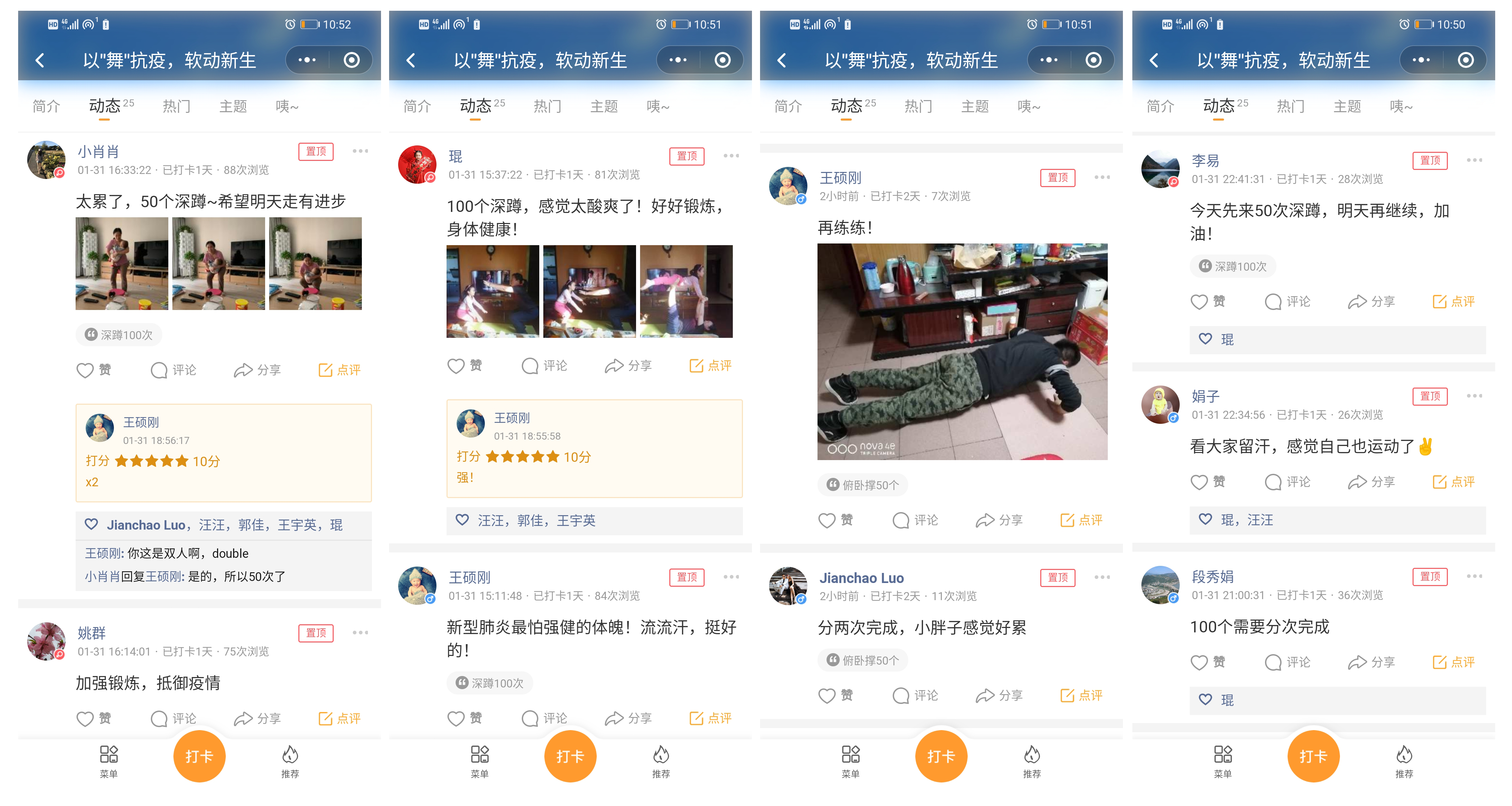 “以‘舞’抗疫,软动新生”打卡活动利用微信小程序中的“小打卡”应用,创建了“做100个深蹲”、“做50个俯卧撑”、“做100次开合跳”等15个打卡主题,从2020年2月1日至2月15日,广大的教职工每天以不同的运动方式加强身体锻炼,并在微信小程序中发布日志,完成打卡。