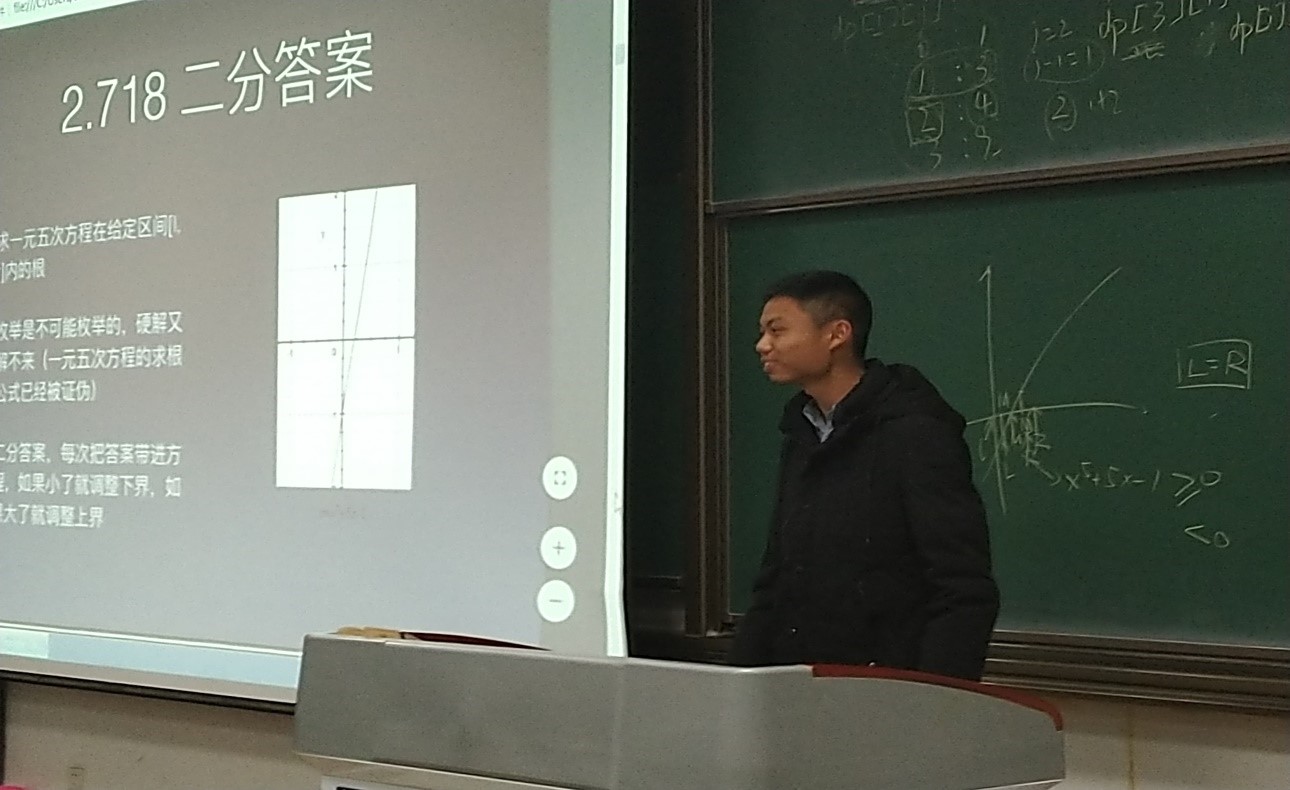 接下来是来自微电子四班的王烁宇同学为大家讲解。王烁宇同学主要从编程工具、如何高效AC,学习编程的良好要素和若干题目类型这几个方面来介绍自己的学习经验。王烁宇同学的报告由浅入深,一步一步带着同学们探索编程世界的奥秘。例如一个求一元五次方程的题目,通过由区间到枚举到二分答案的步步深入,加深了同学们对二分法的理解,让同学们受益匪浅。向量的叉乘、贪心法策略……同学们越听越有兴趣,不断地汲取着新的知识。