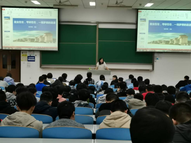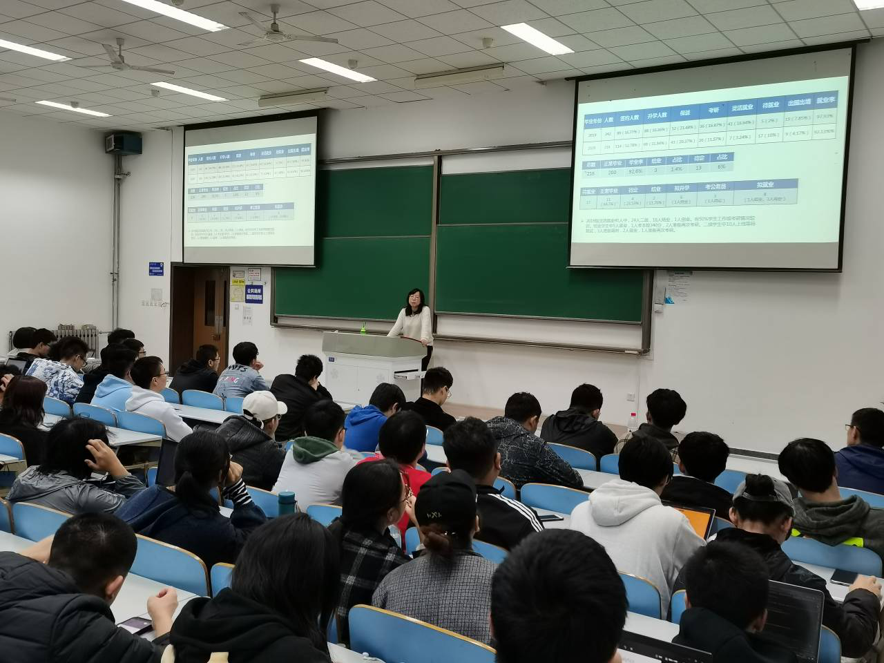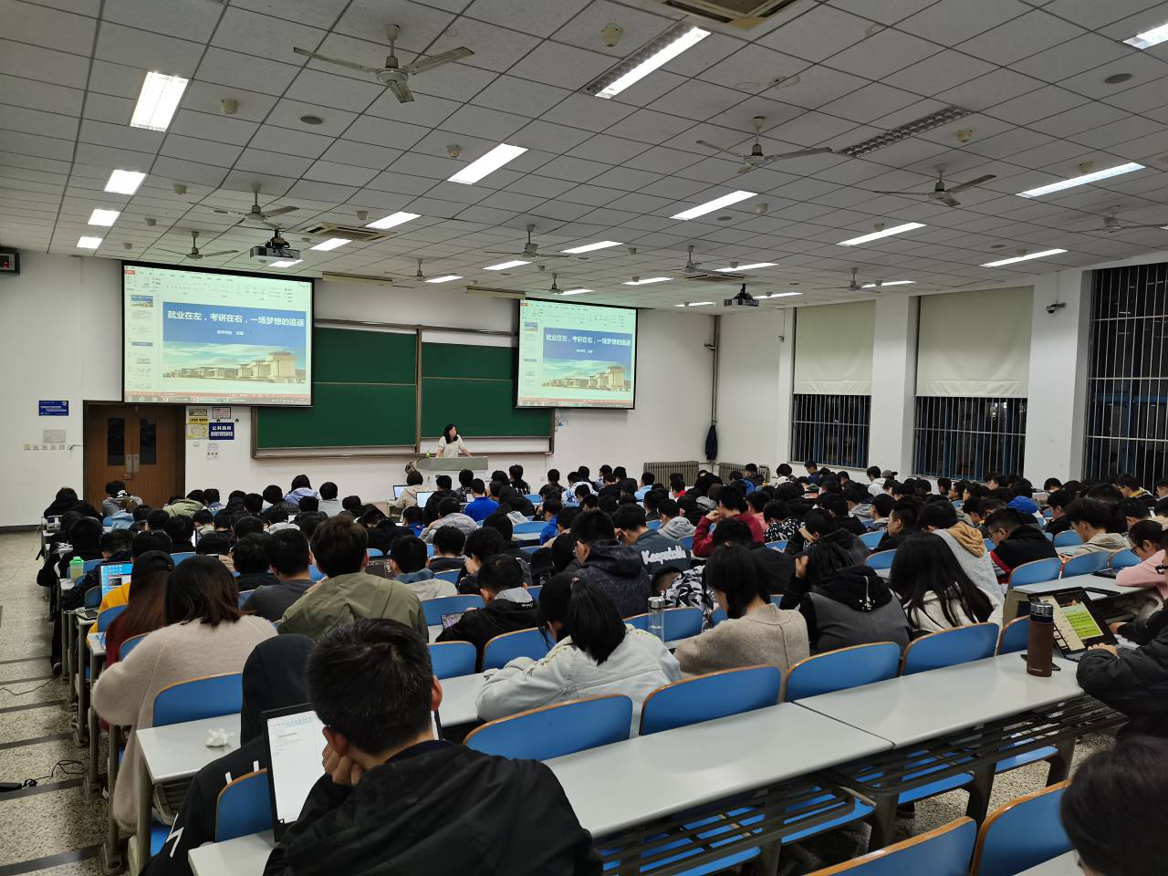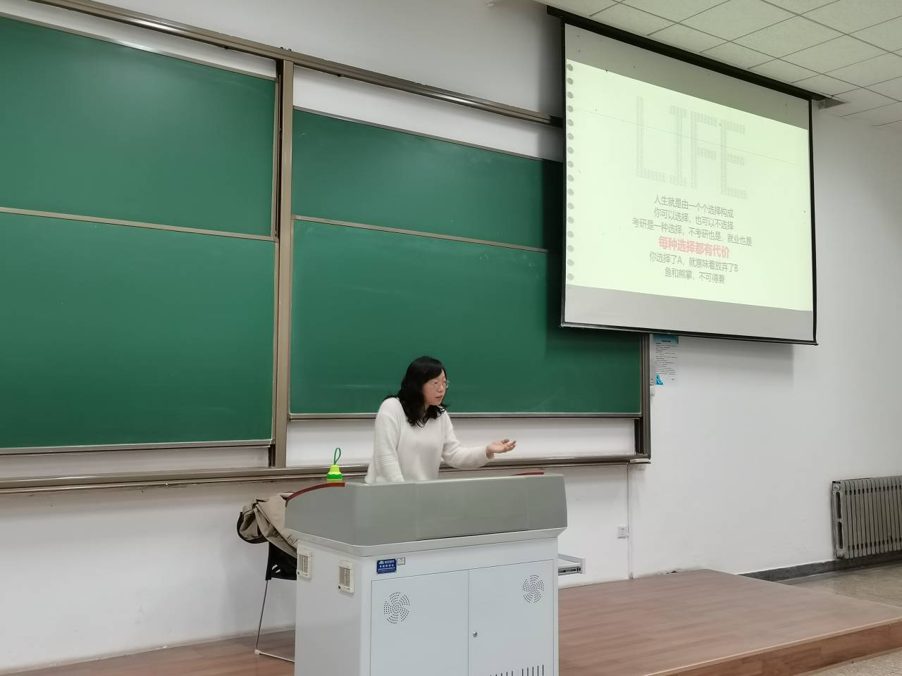 随后,张琨书记通过详实的数据和实际案例,带领同学们分析了近年来的考研形势、报考的人数和录取比例、考研的具体步骤、考研需要做的各项准备等,帮助同学们理智看待考研,打算考研的同学要结合形势,参考数据,结合自身实际,制定切实可行的计划来进行考研的准备。