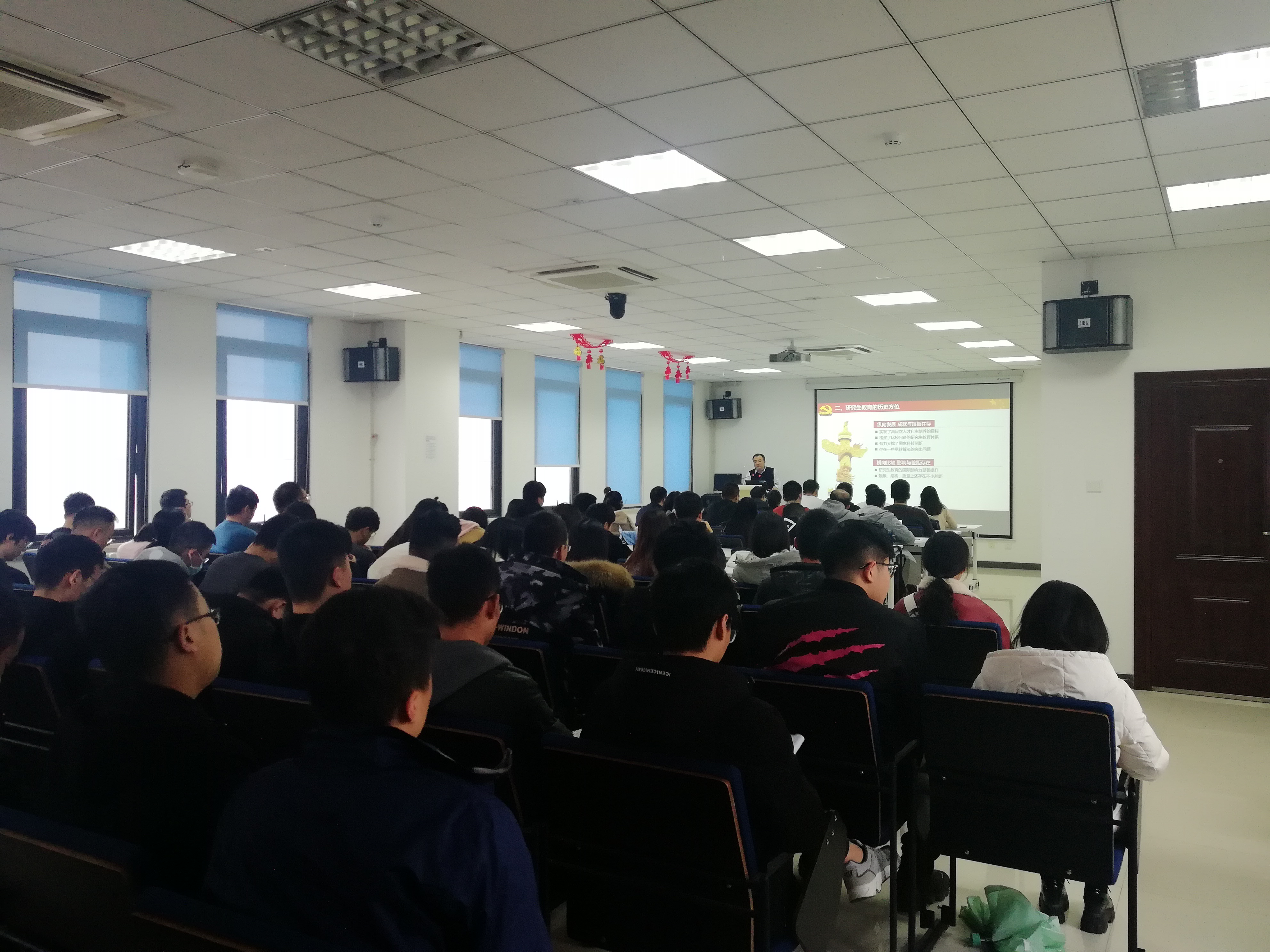 本次党课主要围绕四个方面内容展开。首先,郑江滨经理给大家介绍了培养高层次人才相关的时代背景。“新时代,新征程”,在中国特色社会主义新时代下,党和国家事业发展迫切需要培养造就大批德才兼备的高层次人才。随后,郑江滨经理对研究生教育的历史方位进行了阐述,分别从纵向发展、横向比较、供求关系演化、使命与责任四个方面为同学们进行详细讲解。