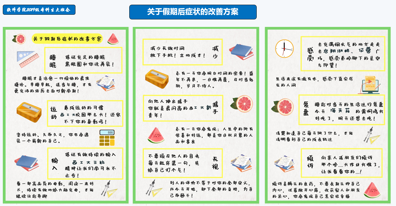 开学初期,部分同学短期会存在“假期后遗症”等症状:上课注意力不集中、学习效率低等问题。针对这些症状,李祖鑫老师切实给大家提出了有效的改进意见,比如坚持运动锻炼、改善睡眠质量、适当放下手机等日常改善方案,举例说明我们如何从各方面回到正常状态,并针对大家存在的问题给予提醒。相信在老师的监督和意见下,同学们会更快恢复到高效学习生活中来。