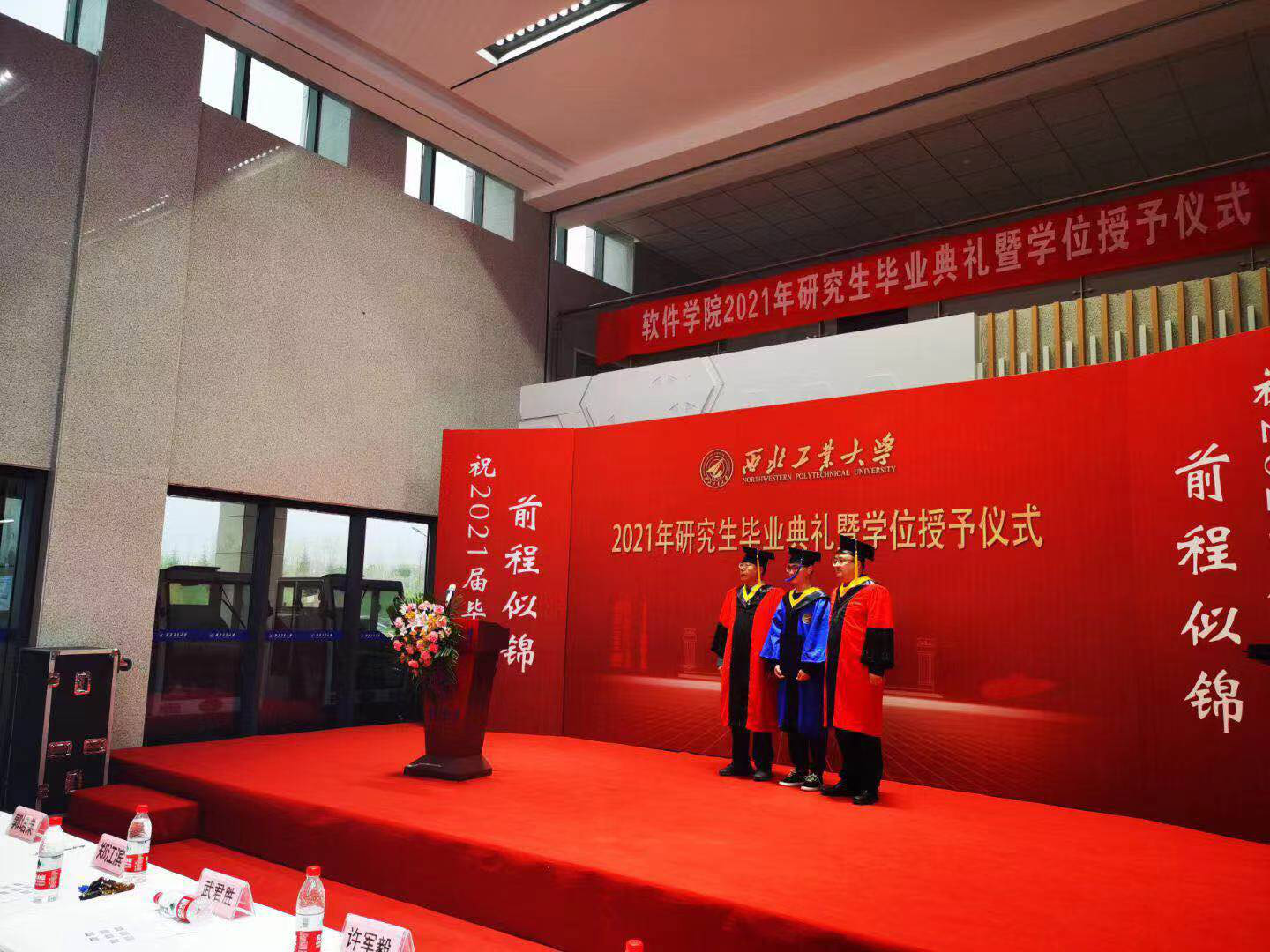 最后,公司为毕业生举办了隆重的学位授予仪式,伴着音乐,头戴学位帽的毕业生们依次走上台,握手、祝贺、授位、拨穗、合影,郑江滨经理和武君胜教授向每一位毕业生送上祝福,始终面带欣慰的笑容。三年的时光,曾经稚嫩青葱的少年一路走来,成长为自信阳光、胸有丘壑的青年才俊,德才兼备社会栋梁。此后路漫漫,愿所有毕业生都能“面向未来,心有所信,行稳致远,不负韶华!”。