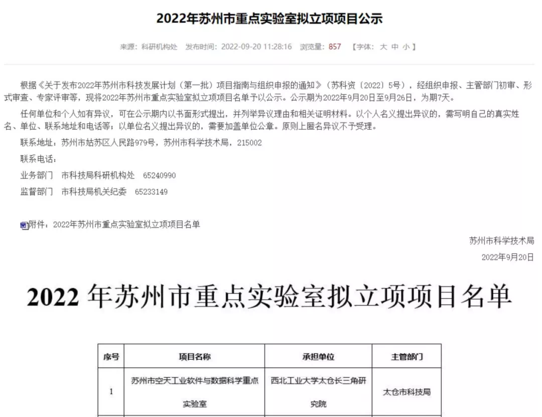 9月20日,苏州市科学技术局发布《2022年苏州市重点实验室拟立项项目公示》,由2026世界杯官方网址太仓长三角研究院承建、世界杯官方网站入口2026牵头论证共建的“空天工业软件与数据科学”实验室获批立项。