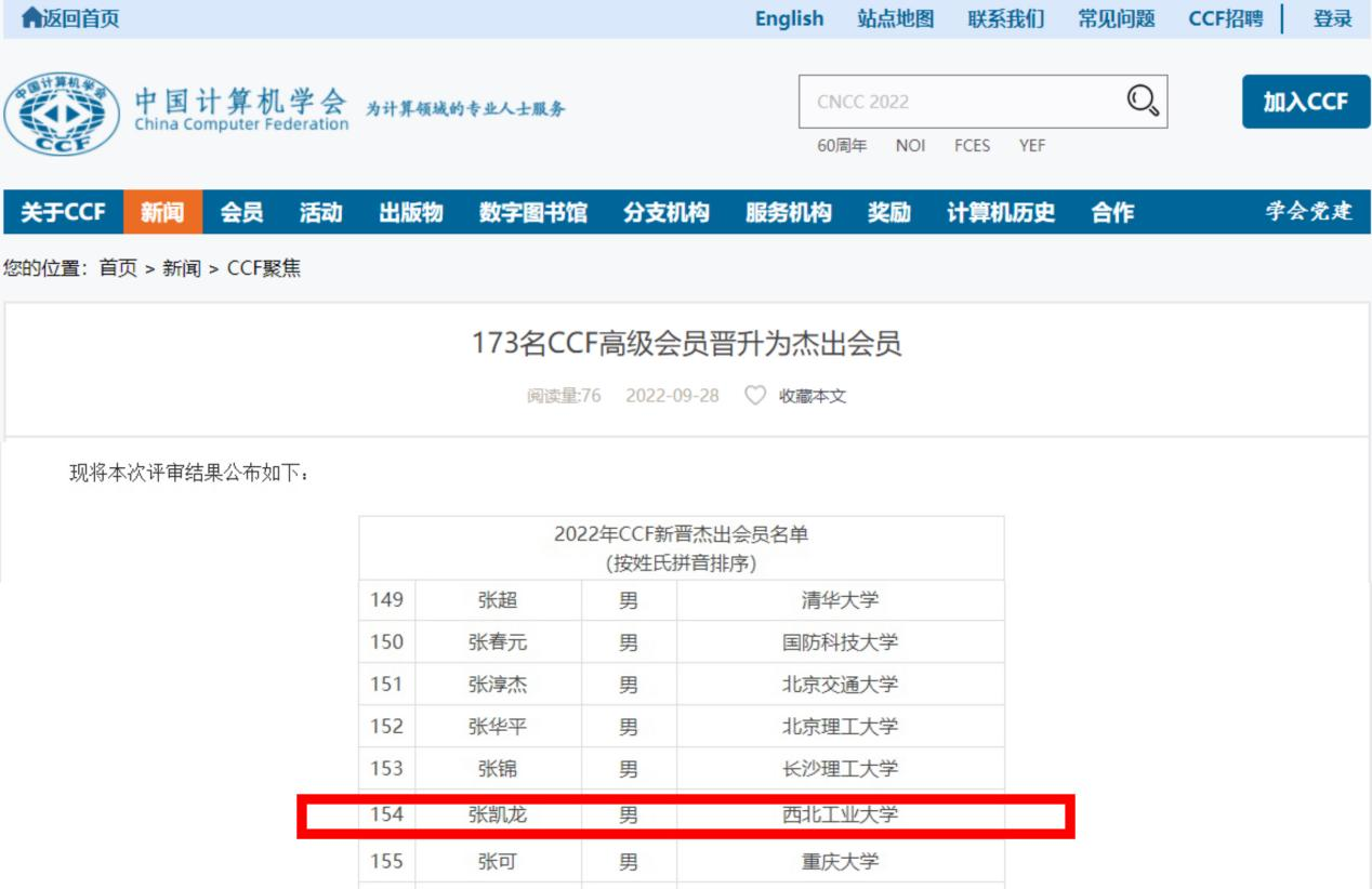 9月28日,中国计算机学会官网发布《173名CCF高级会员晋升为杰出会员》名单,2022年CCF杰出会员评审工作已顺利结束,共有173名高级会员晋升为杰出会员,世界杯官方网站入口2026张凯龙教授名列其中,CCF评审委员会高度评价了张凯龙教授的专业造诣和长期以来对CCF发展的贡献。