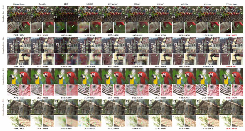 在“From Patch to Pixel: A Transformer-Based Hierarchical Framework for Compressive Image Sensing”文章(IEEE TCI)中,作者提出了一种基于Transformer的级联式图像压缩感知方法TCS-Net,该方法以级联的方式将Transformer作为特征提取器捕获自然图像的长距离特征,并最终建立精细的端到端图像压缩感知映射。该方法摆脱了固有的基于CNN的图像压缩感知模式,并取得了理想图像采样和恢复效果。论文链接:https://ieeexplore.ieee.org/document/10049603
