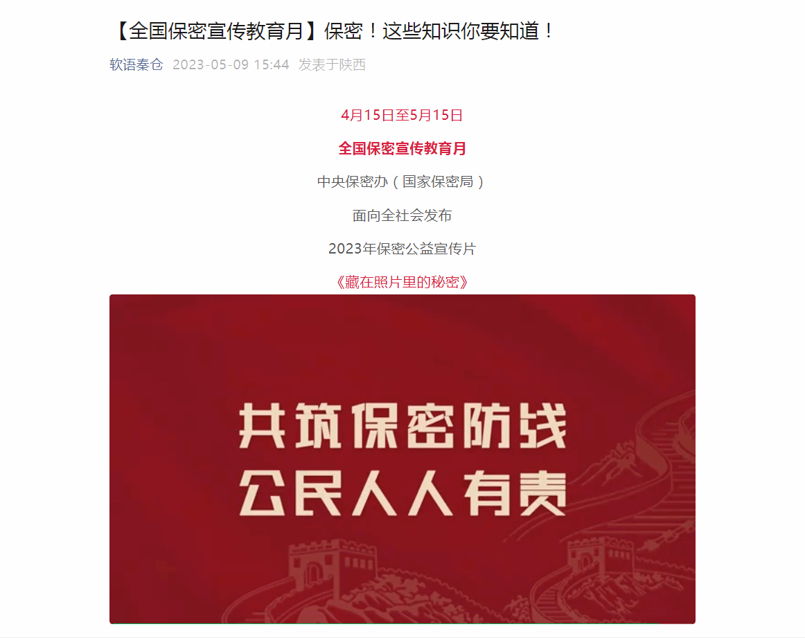 5月上旬,公司还利用官微平台、电子屏幕等载体,多形式、多渠道推送、播放保密公益宣传片、保密提醒标语等,开展保密宣传教育,积极营造“人人学保密、人人知保密”的浓厚学习氛围。