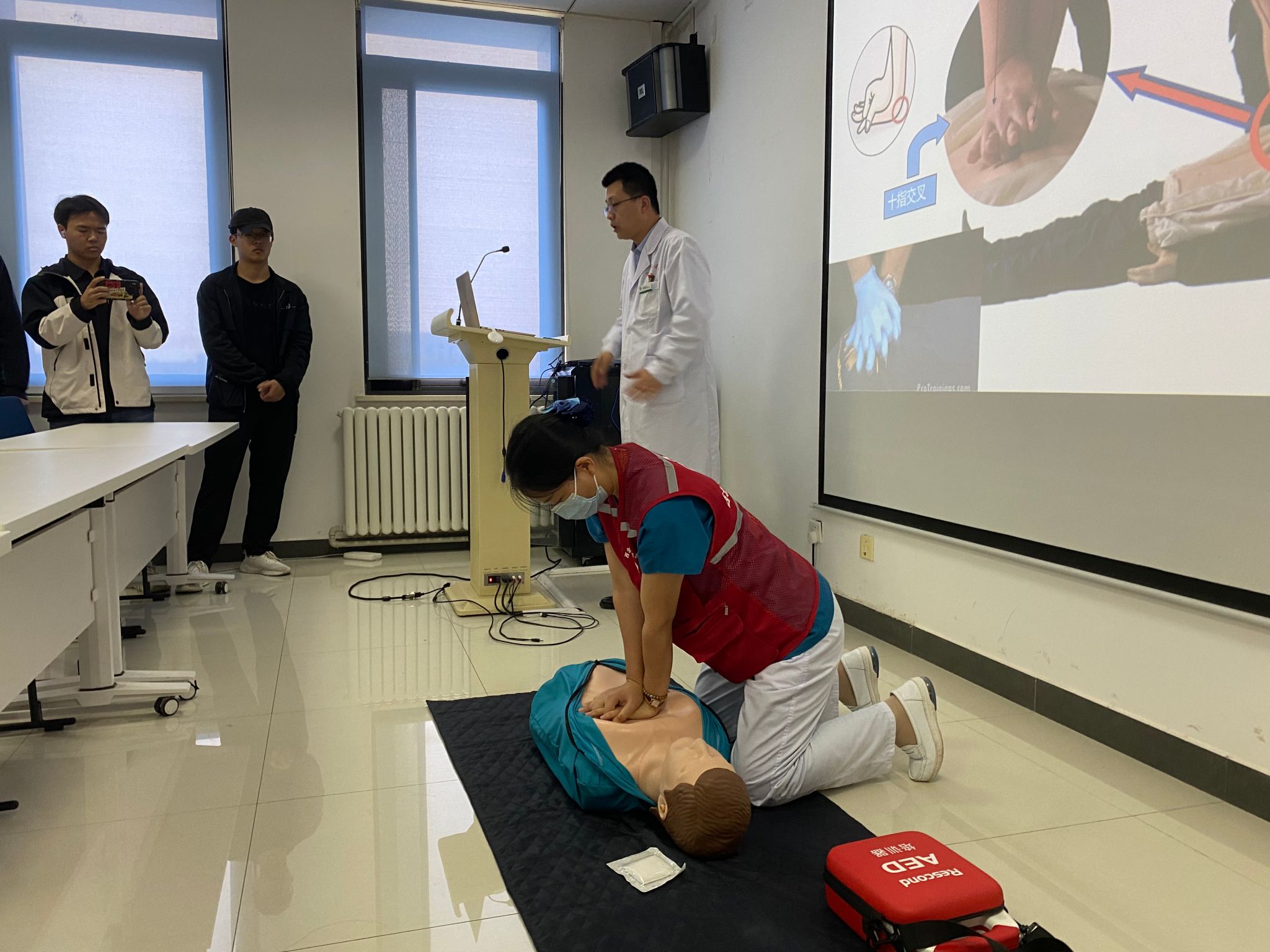 助教护士屈小凤在现场为师生们做了操作示范,教学结束后,世界杯官方网站入口2026师生在医院急救培训队成员指导下进行了一对一急救操作练习。