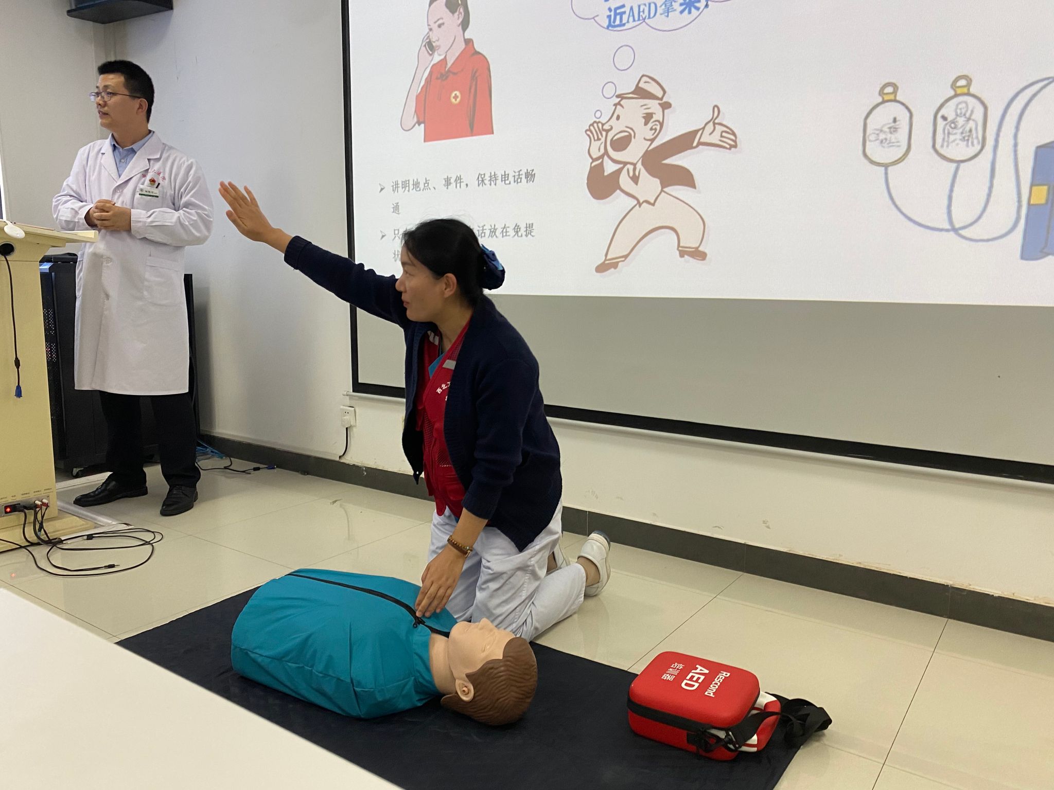 签约仪式后,何凯亮进行了题为《急救知识与技能培训》讲座,他从自身经历出发,向世界杯官方网站入口2026师生详细讲解了心肺复苏基本理论知识、徒手心肺复苏术的操作要点、AED的使用以及海姆立克急救法的操作要点等急救知识与技能。