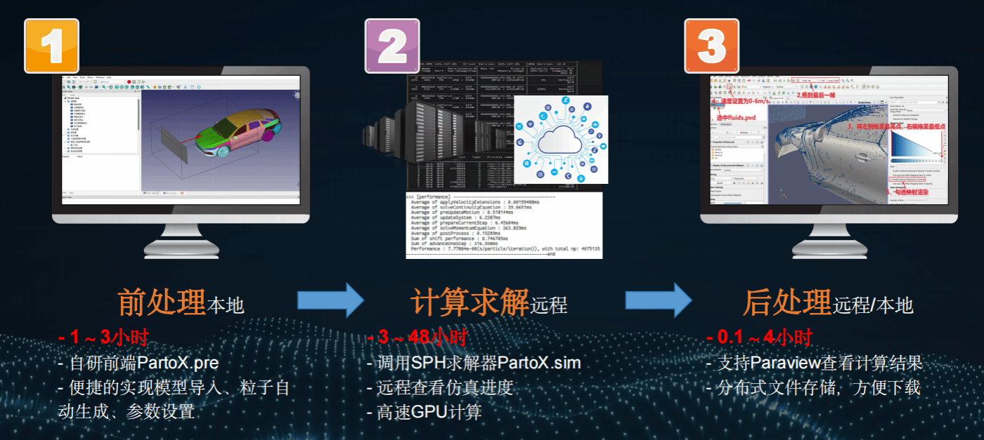 PartoX是一种基于无网格方法的新型计算流体力学(CFD)仿真软件,通过借助GPU异构架构加速解算,其计算效率和基于CPU的传统CFD软件相比可提高1到2个数量级,可将计算时长从一周降低到数小时。PartoX采用完全自研的粒子生成模块,可以实现快速、自动化的前处理,显著降低工程师的前处理时长。通过集成复杂刚体运动模块、气动力瞬态耦合模块、表面张力/接触角/壁面粗糙度等丰富的物理模块,PartoX可以有效的处理广泛存在于陆地、空天、海洋领域中的复杂界面流动问题。目前PartoX已在国内多家主机单位开展验证和试用,被广泛应用于如飞机海上迫降、结构物出入水、车辆水管理、齿轮箱传动系统润滑、电机喷淋冷却等过程中存在的典型流动机理研究。