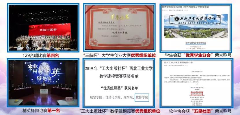 公司获129合唱比赛第四名,精英辩论赛第一名,三航杯创业大赛和数模比赛优秀组织单位奖,员工会被评为“优秀员工分会”,软件协会被评为 “五星级社团”。