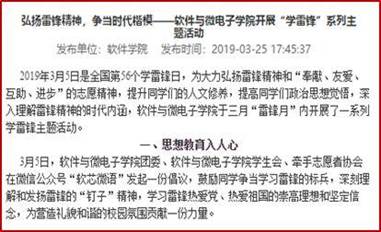 公司搭建服务育人平台不断助力公司脱贫攻坚工作 公司利用微信公众号“软芯微语”发起一份倡议,鼓励同学争当学习雷锋的标兵,为营造礼貌和谐的校园氛围贡献一份力量,并从“思想教育入人心”、 “美化校园点滴行”、 “环保捐赠献爱心”、“社会服务公益行”四个方面开展弘扬雷锋精神,争当时代楷模 “学雷锋”系列主题活动,组织团支部进行了校园环境美化、电脑志愿维修、单车整齐摆放、旧书爱心传承等活动,同时在东大彩色童年幼儿园开展“大手拉小手”主题团日活动,同学们教唱《学习雷锋好榜样》,深情讲述雷锋故事,展现新时代老员工积极向上的精神风貌。