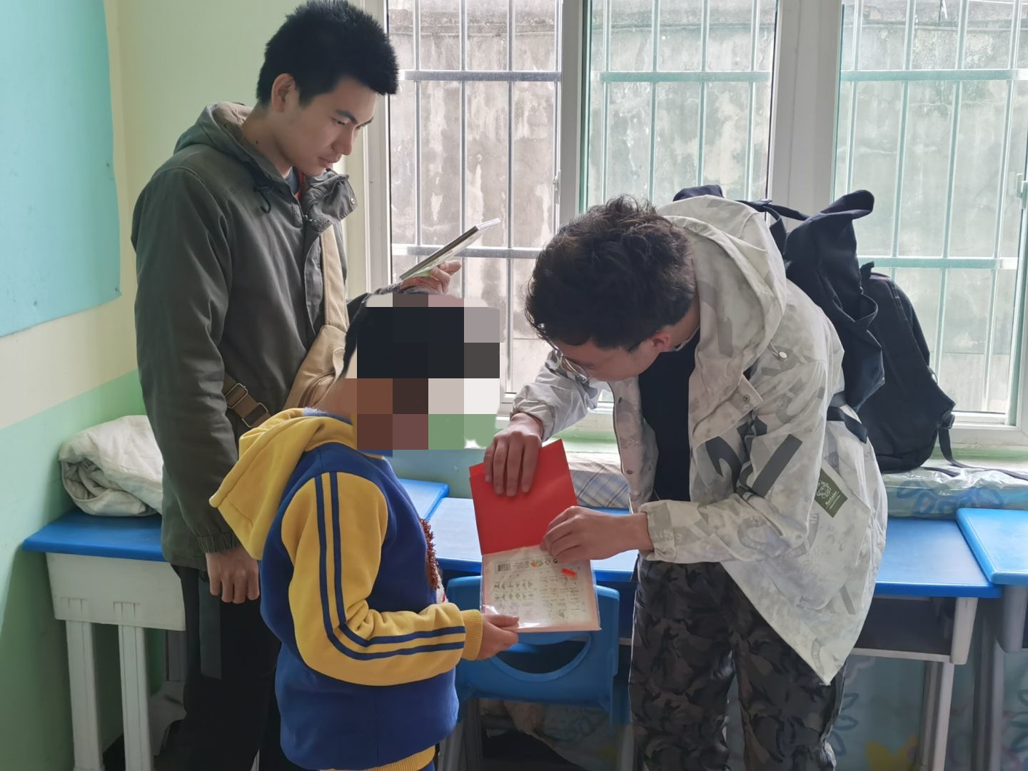 来到教室,志愿者们和儿童做起了游戏,志愿者们充分发挥自己的特长,教小孩子们折纸、唱歌。一张张彩色的纸在他们的手中变成了千纸鹤、纸飞机、纸青蛙,志愿者很快和这群孩子打成一片,孩子们乐在其中。