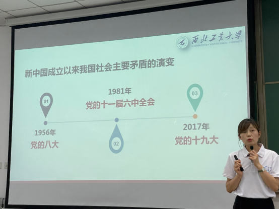 王换引经据典,以毛泽东同志在《矛盾论》里的论述引出矛盾的普遍性,她表示社会主义社会充满矛盾,而矛盾是社会发展的动力。1956年,党的八大报告指出,“我们国内的主要矛盾,已经是人民对于建立先进的工业国的要求同落后的农业国的现实之间的矛盾,已经是人民对于经济文化迅速发展的需要同当前经济文化不能满足人民需要的状况之间的矛盾。”“把握主要矛盾,实事求是,才能找到发展的正确道路”,王换如是说到。