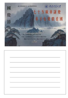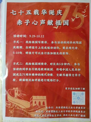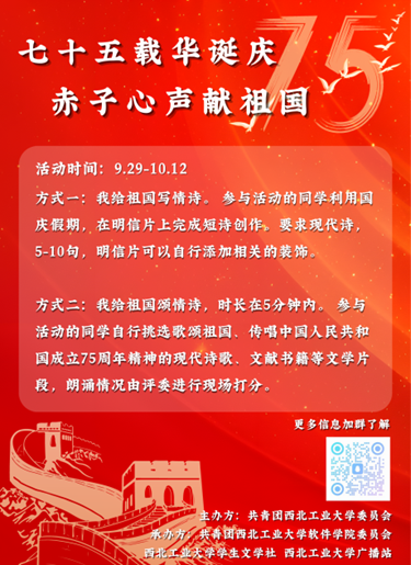 在这个金色的秋天,我们即将迎来一个特别的日子——祖国的生日。为了表达我们对祖国的无限热爱和崇高敬意,我们将举办一场主题为“为祖国献情诗”的诗歌活动。我们诚邀每一位热爱诗歌、热爱祖国的朋友,用你们最真挚的情感,最动人的词句,共同谱写对祖国的赞歌。活动期间,参赛者可以在指定地点领取特制的明信片,围绕“对祖国的爱”这一主题进行诗歌创作,诗歌形式不限,可以是现代诗、散文诗、古体诗等。活动结束后,校文学社组织评委团队,对所有提交的作品进行评审,根据其创意、情感表达和文学价值评选出最佳作品。此次诗歌创作赛道不仅是对创作能力的考验,更是对祖国深情厚谊的表达,弘扬爱国主义精神,增强校园文化氛围,让员工们在诗歌中表达对祖国的热爱和对未来的憧憬,彰显西工大学子的爱国精神。