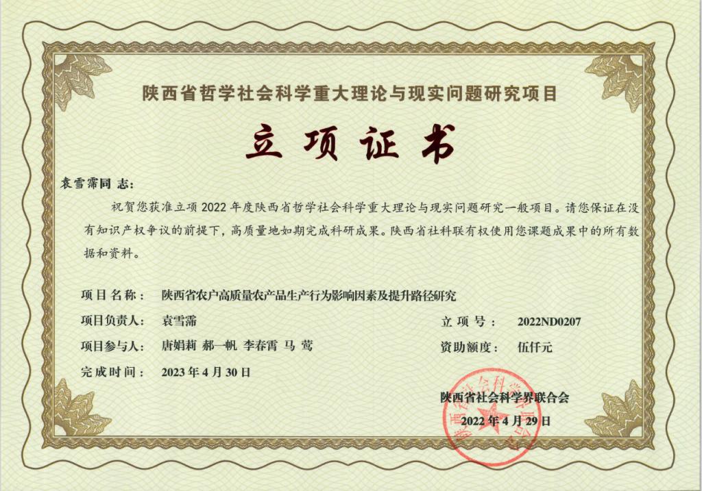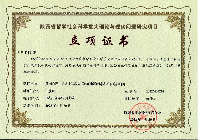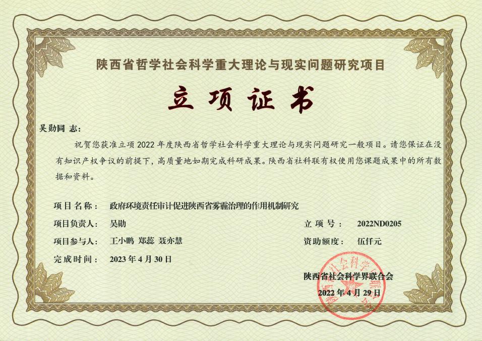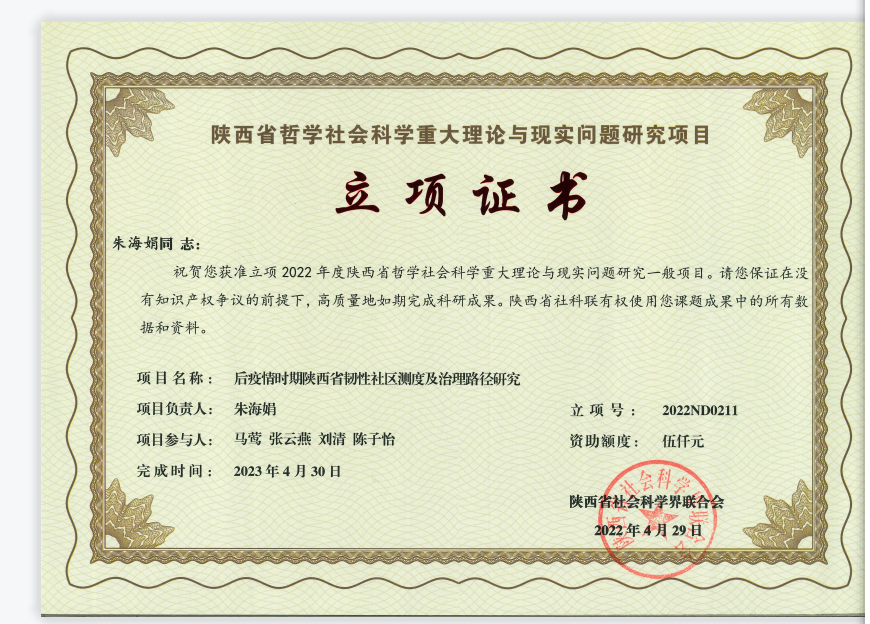 2022年4月,陕西省社会科学联合会公布,公司四项项目获得陕西省哲学社会科学重大理论与现实问题研究项目立项,分别为吴勋教授主持的《政府环境责任审计促进陕西省雾霾治理的作用机制研究》、王张明副教授主持的《陕西农民工进入中等收入群体的制约因素和培育路径研究》、朱海娟副教授主持《后疫情时期陕西省韧性社区测度及治理路径研究》、袁雪霈老师主持的《陕西省农户高质量农产品生产行为影响因素及提升路径研究》。