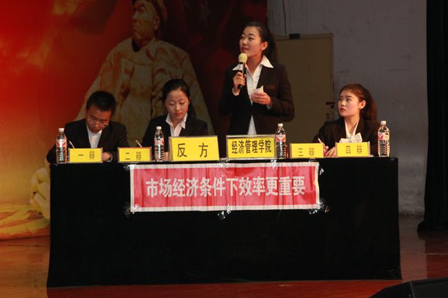 赛双方在“市场经济条件下,公平更重要”还是“市场经济条件下,效率更重要”的辩题下展开了激烈的辩论。双方辩手反应迅速,陈述精炼。在场的观众被辩手们