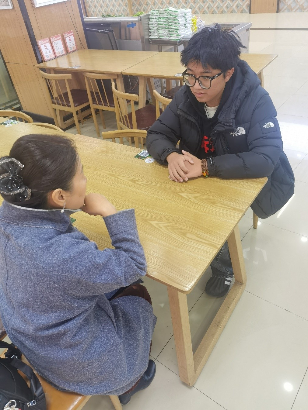 2025年12月2日中午,A区食堂的2楼,来自商管2302的谢朋程同学和李继翠老师在谈这两年学习情况,尤其是自己的各项社会实践,以及未来的规划,显得很兴奋,李老师认真听着这位来自安徽的小伙子快乐的讲述,看着从大一一点点成长起来的大三员工很是欣慰。
