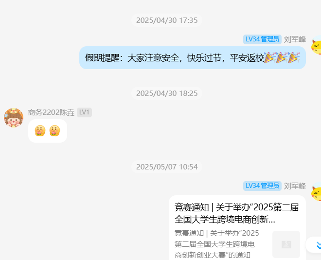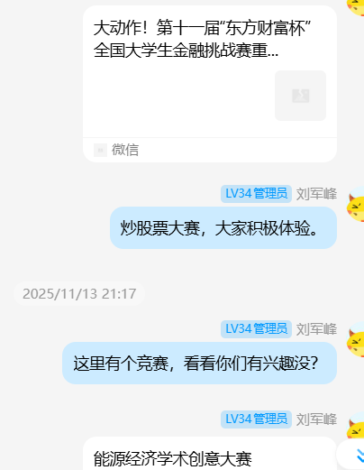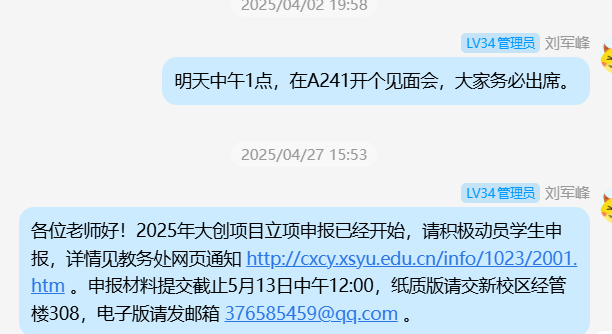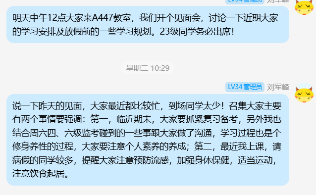 2025年11月16日下午3:00,刘军峰老师于经管人文楼208室指导导师制毕业生员工,要求其他非毕业班同学到场旁听。