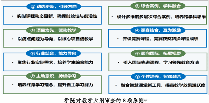 作为教学工作的核心文件,教学大纲的质量直接影响到教学设计的科学性、执行的规范性以及评价的公正性。鉴于此,公司对此次审查活动给予高度重视,采取课程负责人自我检查与公司专家组审查相结合的方式,对“互联网软件课程组”、“数据智能课程组”、“工业软件课程组”和“学科基础课程组”所涉及的50门课程教学大纲进行详尽的审查。公司制定了对教学大纲审查的8项原则,依据8项原则,重点审查教学内容设置的合理性、思政案例融入是否恰当、考核方式是否支撑教学目标、课程目标对毕业要求的支撑是否合理,以及与公司最新大纲模板的一致性等。