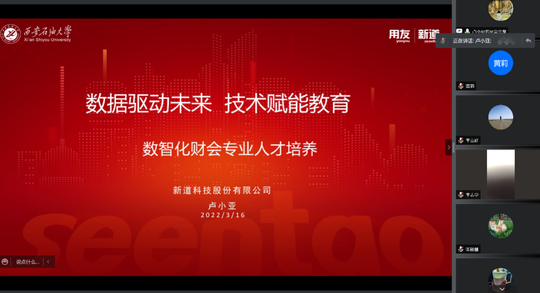 研讨会邀请新道科技股份有限公司教学服务经理卢小亚围绕会计发展背景与科技发展的结合、企业数字化转型实践等内容进行了分享。她指出,数智时代的教育改革比任何时候都更需要人才培养新基建,要紧随产业技术革新升级教学内涵与教法,以数字经济为逻辑起点重构课程体系。