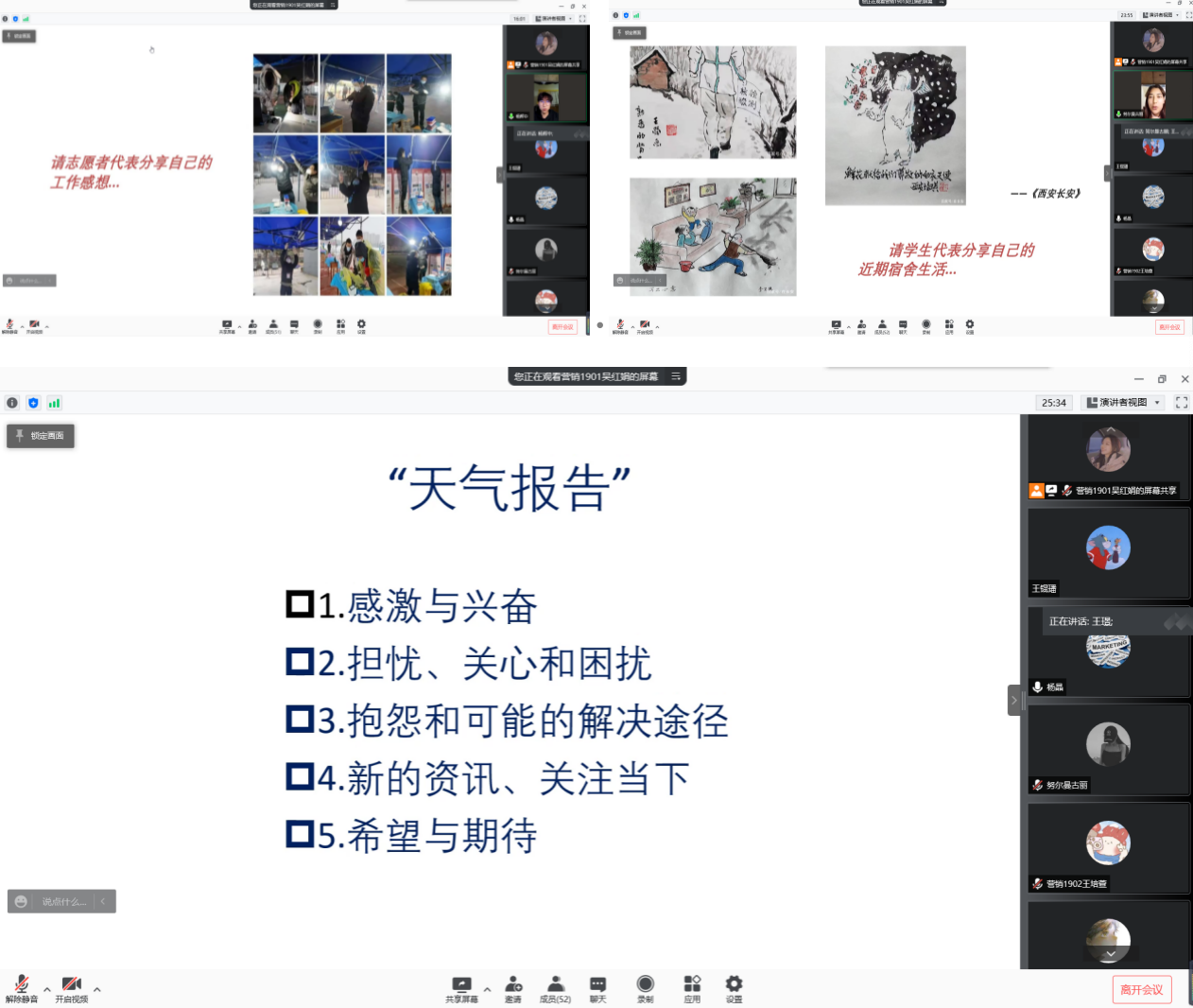 最后,由王君萍经理对本次会议作总结,王经理建议由营销专业两个班班委组织一些团队性活动,带动起大家的学习积极性,增强大家的集体荣誉感,帮助大家尽快明确自身定位,提前做好职业准备。她倡议大家,在封控管理期间,充分利用各种渠道,例如大学慕课,bilibili等平台开展线上学习,不断充实提升自己。王经理向同学们赠言“无论外部怎么样变化,自身站稳脚跟,稳步前进!”