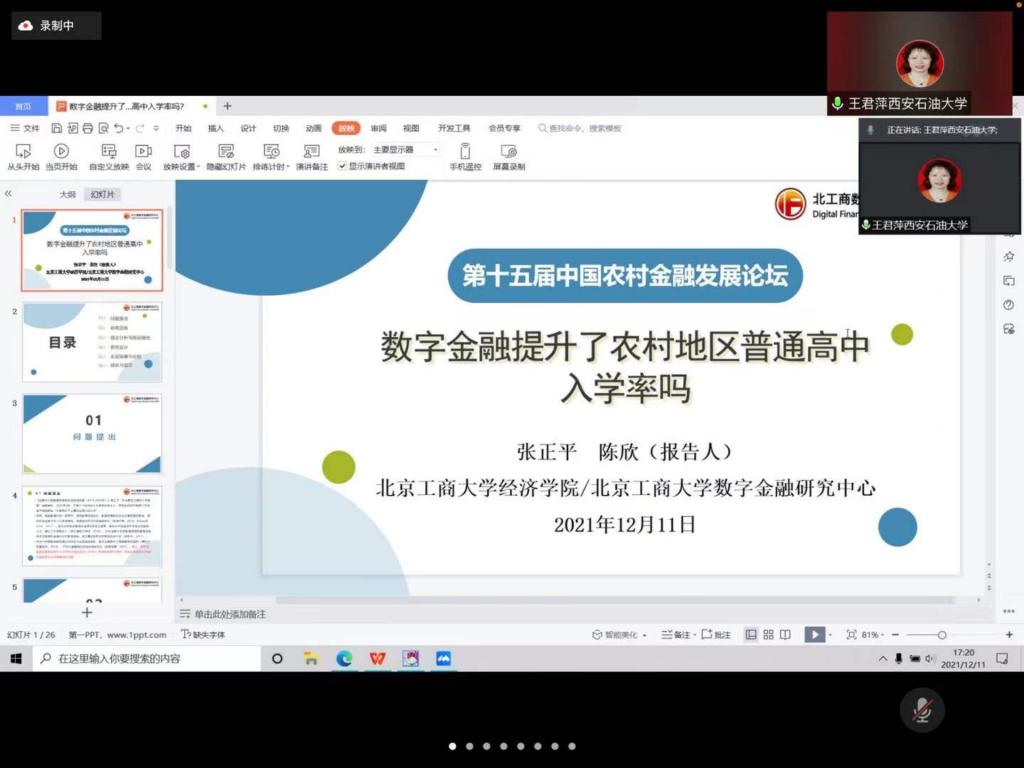 12月11—12日,第十五届中国农村金融发展论坛在吉林财经大学和线上平台同步举行。世界杯官方网站入口2026经理王君萍教授应邀在“数字普惠金融理论与实践”分论坛作点评。公司教师刘莎,研究生刘亚倩、鲍晶婷、庞帅奇参加了本次论坛。