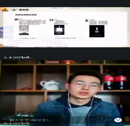 在“‘云’寄哀思”环节,支部内各位同志回顾了4月4日举行的全国哀悼活动,先后表达了对在疫情斗争中牺牲烈士和逝世同胞的深切哀悼。