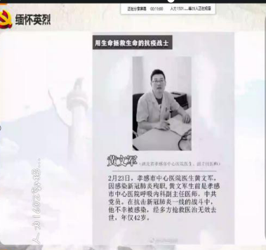 在“缅怀英烈”环节,支部全体党员通过集体观看视频,阅读英烈事迹,缅怀了用生命拯救生命的抗疫战士黄文军、刘智明、江学庆、梅仲明、夏思思、肖俊、李文亮、彭银华等人。