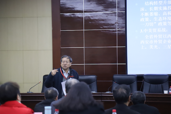 西安交通大学经济与金融公司教授、博导、“一带一路”自由贸易试验区研究院服务贸易中心主任冯宗宪,做题为《当前面临的对外开放形势分析》的学术报告。冯宗宪教授通过详尽的宏观数据分析,为大家展示了我国“十三五”期间经济增速由降转升,又由升转降的复杂变化情况,指出中美贸易摩擦对我国出口造成了显著影响,最新贸易谈判协议的初步达成,有望降低此种影响,带来陕西对外出口的新转机,建议陕西紧盯党的十九大精神和工作安排,用好“一带一路”的政策红利,保持经济稳定增长。