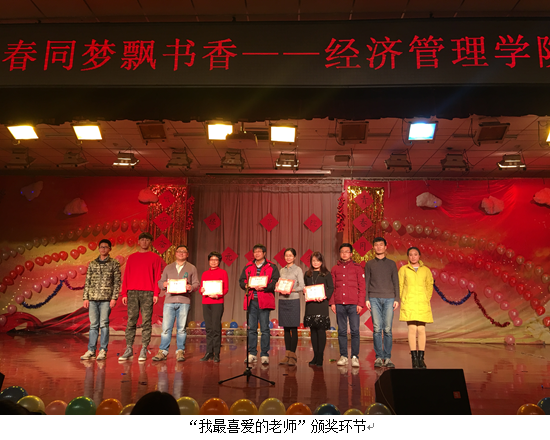 “我最喜爱的老师”颁奖把晚会带到了高潮。获奖的老师分别是陈丁、董春诗、苟三勇、巩前胜、郝上京(理公司)、黄莉、侯珂、李立群、刘松华、刘永爱、牛波、王毓军、肖焰、尹志国、郑蕊。由同学为我们的获奖老师颁奖。