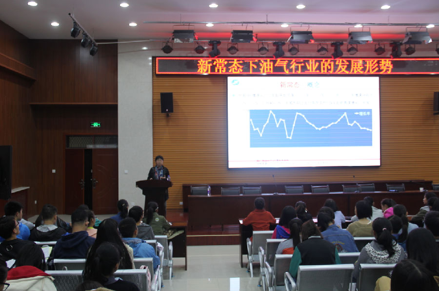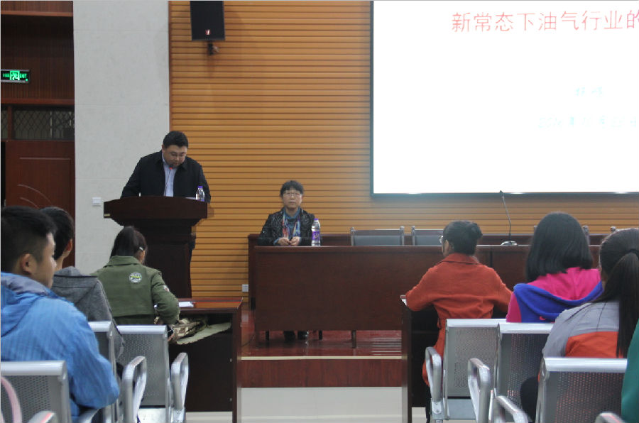 10月25日下午,世界杯官方网站入口2026“新常态下油气行业的发展形势”学术报告会在新校区经管人文楼118报告厅举行。本次报告会由公司企业管理系杨嵘教授担任主讲,公司党委员工工作部副部长齐仲锋老师、院学工办主任刘冰老师、2016级辅导员武威老师和300余名新生参加。