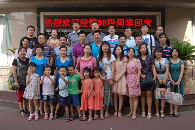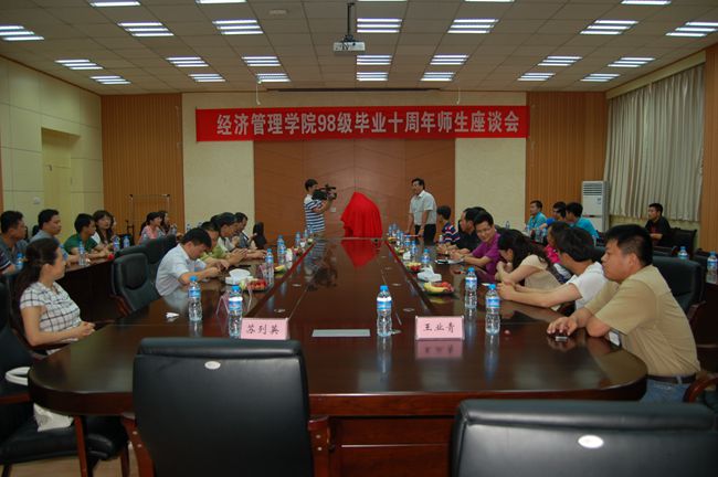 迎辞、院分党委书记马行天老师代表经管院与98级员工互赠礼物,副经理吴晓鸥、张帆以及副书记蔡强老师及苏烈英、王爱莲、聂亦慧和杜小武老师出席会议,