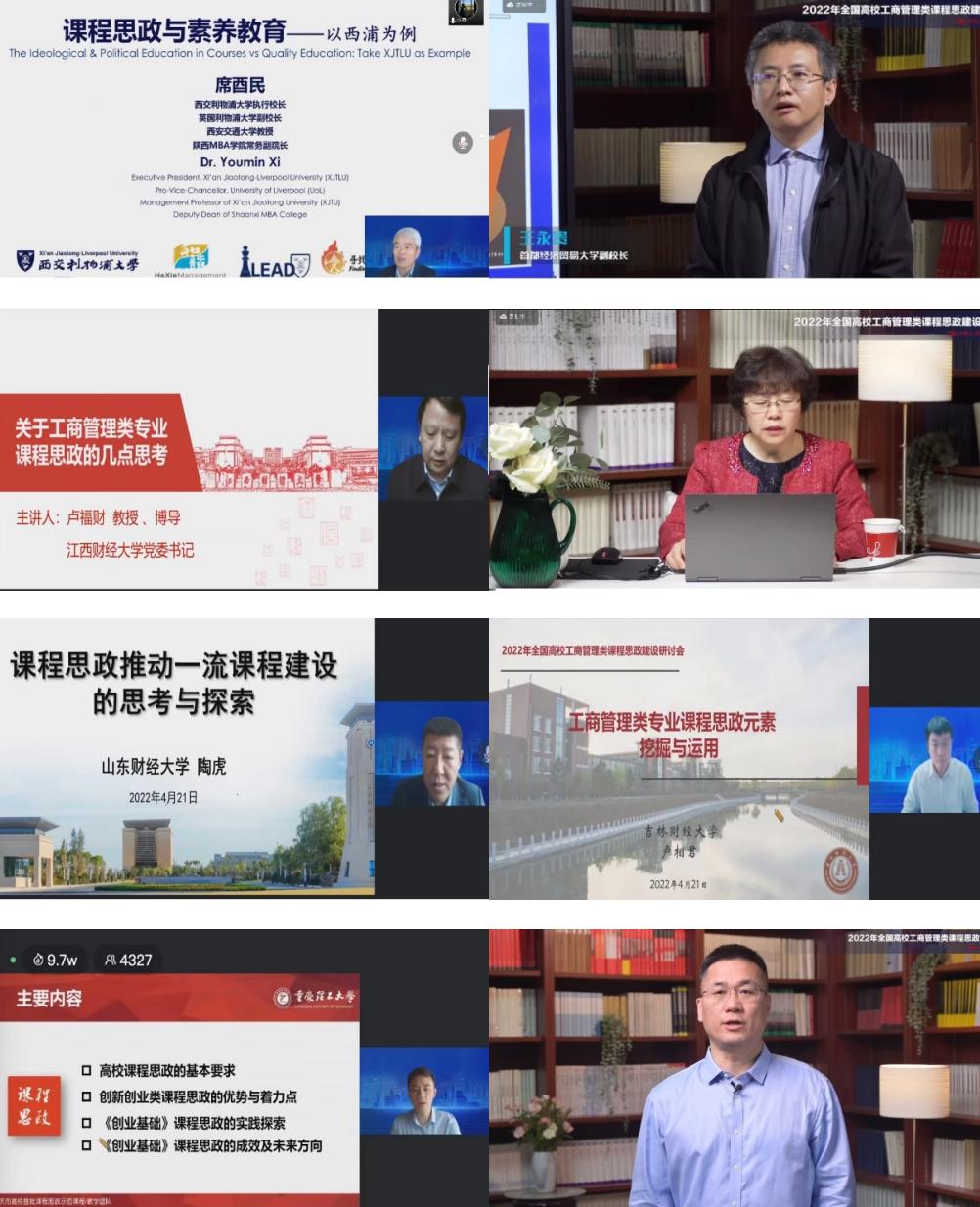 会上,教育部工商管理类专业教指委主任委员席酉民,教育部工商管理类专业教指委委员王永贵、卢福财、雷涯邻、陶虎、卢相君,全国工商管理专业学位研究生教育指导委员会委员徐飞,以及中国人民大学教授王凤彬、东北财经大学教授陈福军、重庆理工大学教授李巍分别就工商管理类课程思政的素养教育、指南编制与进展、艺术与思考、横纵体系构建、一流课程建设、思政元素挖掘、以及在《市场营销学》、《战略管理》、《管理学》、《生产运作管理》等课程中经验与思考作主题演讲。