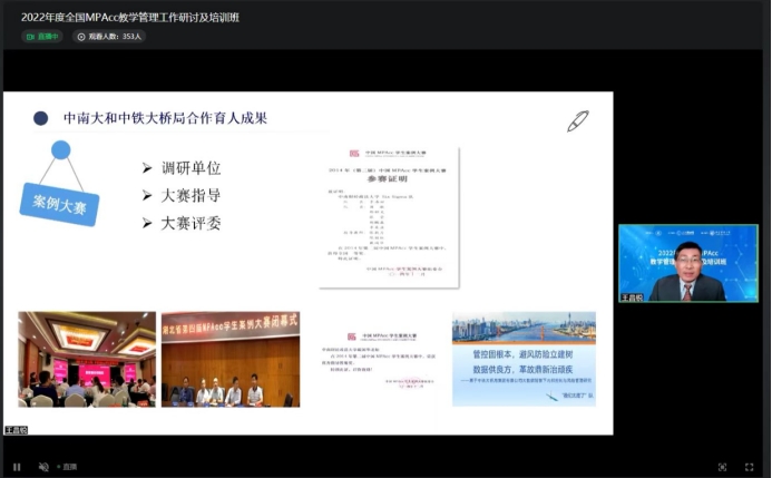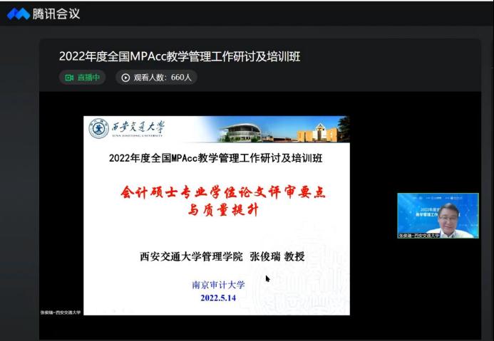 为保障我国MPAcc教育质量,提高MPAcc培养的整体水平,由全国会计专业学位研究生教育指导委员会指导、中国人民大学主办、南京审计大学承办的2022年全国MPAcc教学管理工作研讨及培训班于5月14-15日以线上方式举办,主要内容包括MPAcc教育工作总结与展望、质量认证单位MPAcc培养经验总结、论文专题主题分享等。世界杯官方网站入口2026经理王君萍、MPAcc专业负责人宁宇新、MPAcc专业导师、校外导师联系人等教师代表参加了此次研讨及培训班。