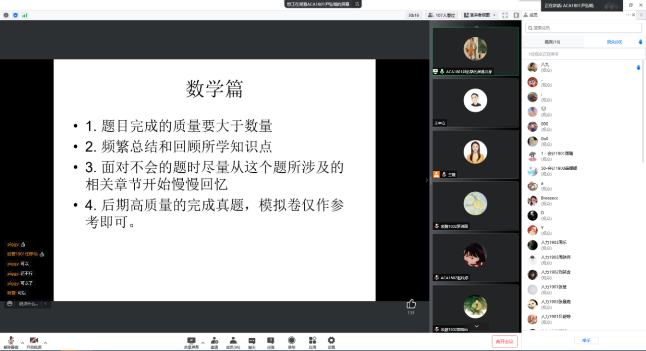 会议首先由辅导员王中立进行考研动员介绍,就当前毕业生所面临的考研形势进行分析,并鼓励大家坚定考研信心,科学选择目标,潜心复习备考,争取顺利上岸。18位优秀考研毕业生代表依次进行经验分享,他们从自身考研经历出发,围绕如何选取院校专业、制定复习计划、调整备考心态以及复试中的注意事项等方面进行交流,并着重介绍了考研英语和数学科目的学科特点、知识难点、考试重点、复习要点,并建议大家在备考途中要以坚持不懈的恒心、持之以恒的耐心、百折不挠的信心去面对挫折与挑战,要培养总结知识的归纳能力,对待错题、难题、偏题要及时进行分类整理与巩固,日积月累、有效提高。辅导员王璟和王中立对本次考研经验交流分享会表示肯定与支持,同时强调备考同学要以充足的信心、饱满的热情、科学的方法、合理的计划对待艰苦奋斗的考研之路,相信大家通过努力终将实现梦想。