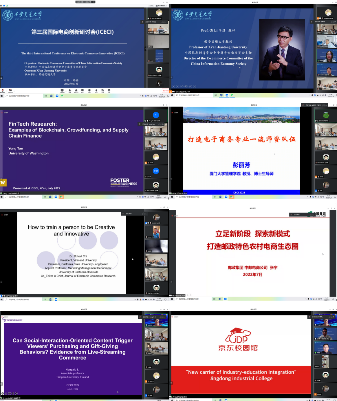 7月9日召开了第三届国际电商研讨会(ICECI),大会由中国信息经济学会电子商务专业委员会主任、西安交通大学教授李琪致开幕辞,华盛顿大学谭勇教授、厦门大学彭丽芳教授、加州州立大学(长滩分校)季擎华教授、中国邮政集团有限公司电子商务有限公司副总经理张宇、坦佩雷大学黎红秀教授及京东校园馆政校企合作总经理万昌昌分别做了《金融科技研究:以区块链,众筹,和供应链金融为例》、《打造电子商务专业一流团队队伍》、《How to train a person to be Creative and Innovative》、《立足新阶段探索新模式打造邮政特色农村电商生态圈》、《Can Social-interaction-Oriented Content Trigger Viewers' purchasing and Gift-Giving Behaviors? Evidence from live-Streaming Commerce》、《产教融合新载体——京东校园馆产业公司》的主旨演讲,之后进行了三场平行会议,与会代表进行了热烈讨论。