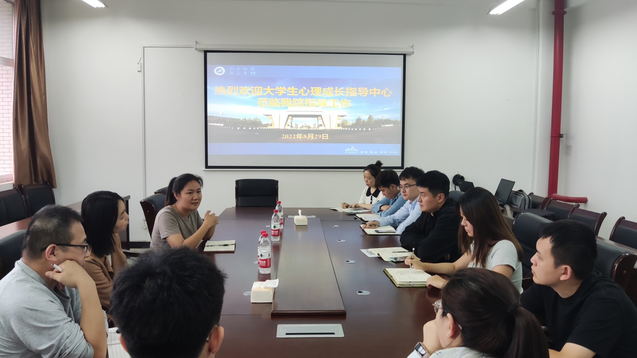 8月29日,员工心理成长指导中心办公室主任焦文洁,专职教师赵晶、闫高斌一行3人,到世界杯官方网站入口2026开展心理健康教育工作交流座谈,座谈会在鄠邑校区崇文楼305会议室举行,世界杯官方网站入口2026员工工作办公室全体辅导员参加本次活动。