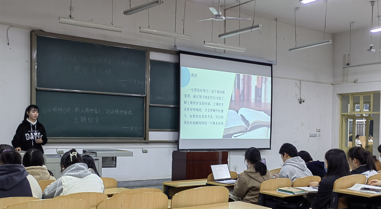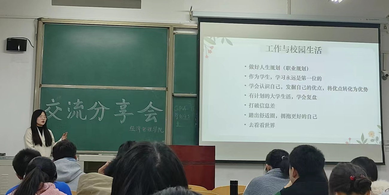 斯乐怡、张瑞同学分别从学习、证书、竞赛、活动、生活等五个方面与大家进行分享。学习方面,向大家展示了自己的学习成绩与获奖证书,强调作为国贸专业员工,应高度重视高数和英语学习;证书方面,强调四六级的重要性及其他证书的考取事项;竞赛方面,希望各位同学密切关注竞赛信息,多认识优秀学长学姐,积极参加各项竞赛;活动生活方面,建议同学们减少内耗,提高效率,学会选择。