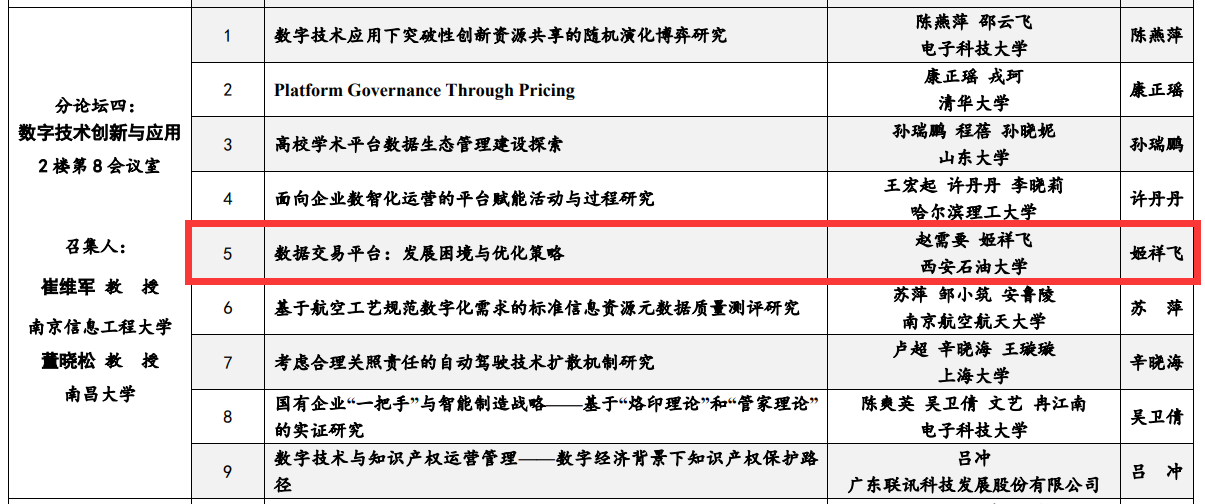 公司教师赵需要和研究生姬祥飞合著的论文“数据交易平台:发展困境与优化策略”入选,并在“数字技术创新与应用”分论坛进行了汇报交流。