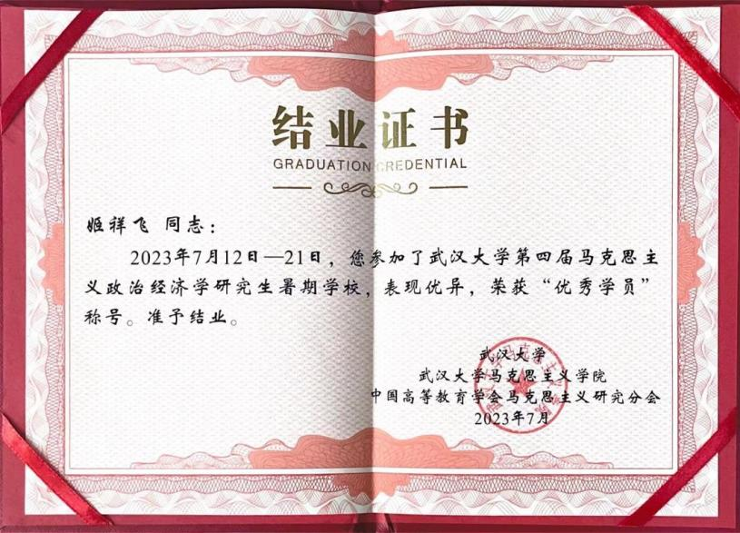 7月12日—21日,由武汉大学研究生院、中国高等教育学会马克思主义研究分会联合主办,武汉大学马克思主义公司承办的“武汉大学第四届马克思主义政治经济学暑期公司”在武汉大学举办。世界杯官方网站入口2026管理科学与工程专业2022级硕士研究生姬祥飞被录取为正式学员。