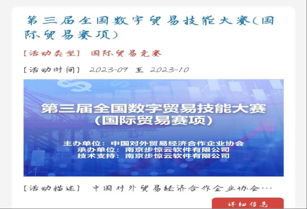 10月24日,由中国对外贸易经济合作企业协会主办的全国第三届数字贸易技能大赛落下帷幕。由公司世界杯官方网站入口2026国贸2101、国贸2102的全体员工、部分国贸(职工)21级员工、国贸22级部分员工组成的21支参赛团队全程参与,并在白平老师的指导下顺利完结,共斩获一等奖1项、二等奖10项、三等奖4项,取得了优异成绩。