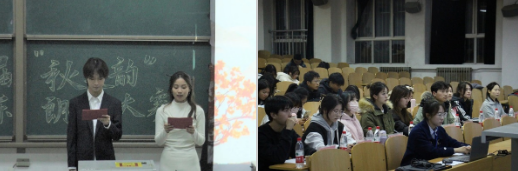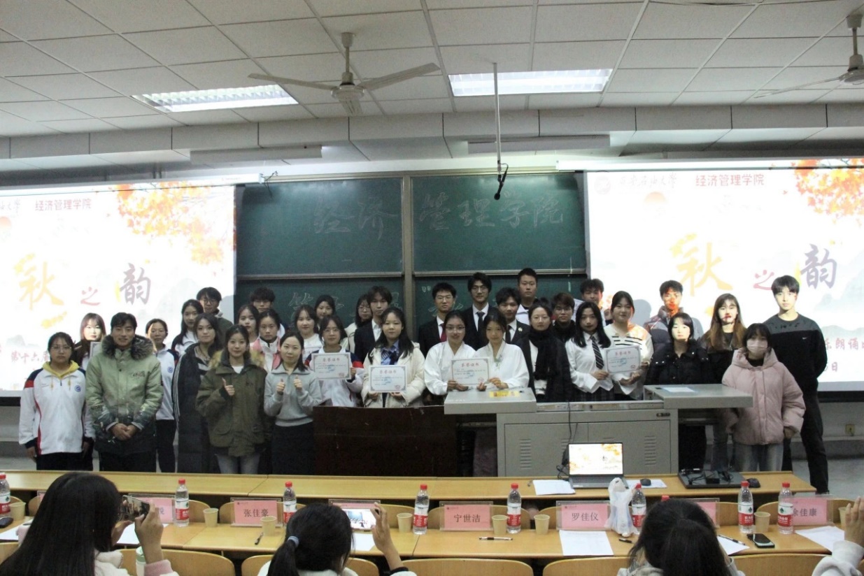 本次比赛以“经典里的人生”为主题,由公司2022级本科生组成的24组选手带来精彩展示,参赛选手们节目风格多样,单人朗诵与团体朗诵相结合,声情并茂、饱含深情地演绎出一个个真实感人的故事、一段段精彩的人生独白、一次次深刻的思想感悟。比赛开篇由张楠等同学带来《秋天里的中国》,铿锵有力、充满韵味;黄俊杰同学的《请铭记雾重庆》,慷慨激昂,让观众为之触动;孙乾炳和曹嘉豪同学对《沉马》的精彩展现赢得了现场观众热烈的掌声。在中场及赛后,公司2022级本科生周靖雨、李铟彤分别为大家带来了精彩的歌曲表演。比赛结束后,评委根据参赛选手现场表现进行打分,经管2302孙乾炳、曹嘉豪,ACA2301黄俊杰,经管2301周恬皙获得一等奖获。任仰为获奖选手颁奖,参赛同学合影留念。