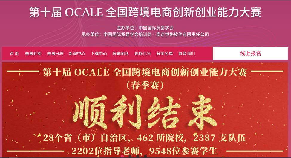 由中国国际贸易学会举办的第十届OCALE全国跨境电商创新创业能力大赛(春季赛)于4月27日圆满结束,公司世界杯官方网站入口202616名本科生参加了本次比赛。参赛团队经历了两轮练习,于4月25日-27日进行了12个回合的最终角逐,最终获得团体一等奖2项,团体二等奖1项。